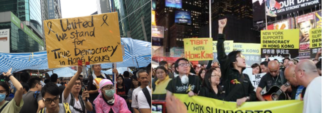 Figure 1. Scenes from Occupy Central in Hong Kong (L) and New York (R), one of the international protest sites. (Images © 2014 NuPolitical Review and International Business Times)