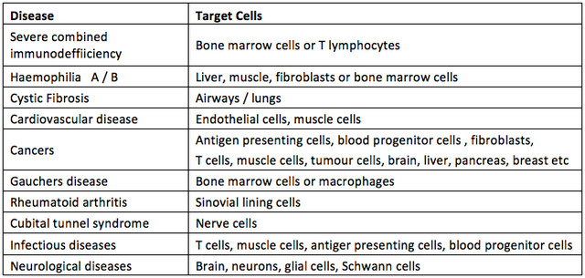 This article briefly discusses some of the materials used in gene therapy and their delivery methods. It reviews the types of disorders for which gene therapy may be useful and compares the advantages and disadvantages of various delivery systems for gene therapy. What Can Be Treated?Gene therapy cells usually treats somatic cells and although originally devised to treat inherited disorders (Evans & Robbins, 1995), most gene therapy now benefits cancer patients. It is also used to treat acquired immune disorders, arthritis and hemophilia (Evans & Robbins, 1995; Mountain, 2000). Gene therapy is an attractive proposition since certain Ribonucleic acids (RNAs) or proteins provide effective treatments but are traditionally difficult to deliver effectively. Conventional treatments for some disorders are invasive, unpleasant, frequently ineffective and often have side effects; gene therapy may allow for treatments without these difficulties. In the case of human acquired immunodeficiency virus (HIV), outcomes have been improved with the use of anti-retroviral drugs (Marathe & Wooley, 2007) but side effects can be unpleasant while current treatments represent disease management rather than any type of cure (Scherer & Rossi, 2011). The virus also mutates swiftly (Campbell & Reece, 2008) and many patients infected with HIV are found to have strains which have developed immunity to one or more of the available drugs (Hirsch et al., 2008; Richman et al., 2004) (Fig 1). Given that in 2011 the UK had an estimated 96,000 people living with HIV (Anon, 2013), the search for a cure is as urgent as ever and it is hoped that gene therapy may provide this cure (Marathe & Wooley, 2007). Treatment SitesSome treatments can be carried out ex vivo and others are only successful in vivo. Ex vivo therapy has been trialled for HIV (Scherer & Rossi, 2011) and Alzheimer’s disease (Tuszynski, Thal, Pay, & Salmon, 2005) amongst others and in vivo therapy has been trialled on Cystic Fibrosis and the majority (but not all) of cancer trials have been in vivo (Mountain, 2000). Delivery may be systemic or local, in local delivery the gene products are delivered directly to the site of treatment, for example to the synovial tissues in the treatment of rheumatoid arthritis (Evans and Robbins, 1995) whereas systemic delivery involves the treatment being applied to more than one site via the circulation; this system has been used to treat lung cancer (Gopalan et al., 2004). Treatment needs to be targeted at different cell types depending on the disorder to be treated, some of which are shown at Table 1. Once they are delivered the gene products may replace a faulty gene (for a genetic disorder) (Verma & Somia, 1997) or they may be used to illicit an immune response to enable killer cells to deal with a tumor (Cross & Burmester, 2006). Gene therapy can even deliver products to code for the production of proteins involved in healing broken bones (Evans & Robbins, 1995); the list is seemingly endless. Delivery MethodsThe biggest challenge facing clinicians in the development of gene therapy is the gene delivery method (Somia & Verma, 2000). Getting the genetic material to the site of treatment is only part of the problem, it then needs to be taken up and expressed (Evans& Robbins, 1995); this is achieved using vectors. In order to ensure delivery of the gene of interest vectors must be accurate and efficient (Miller & Vile, 1995), there is little point in delivering genetic therapies to the wrong cells in the patient. Vectors can be broadly divided into two groups; viral and non-viral (Evans & Robbins, 1995).